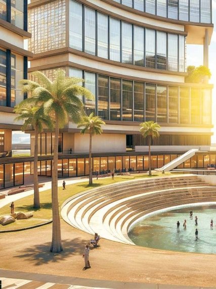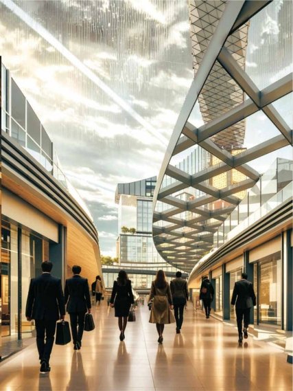 Astrathum includes landscaped courtyards, cultural plazas, modular food courts, AI-enabled retail spaces, mood-based ambient controls, high-speed connectivity, and event-ready open-air arenas — designed for both work and leisure.